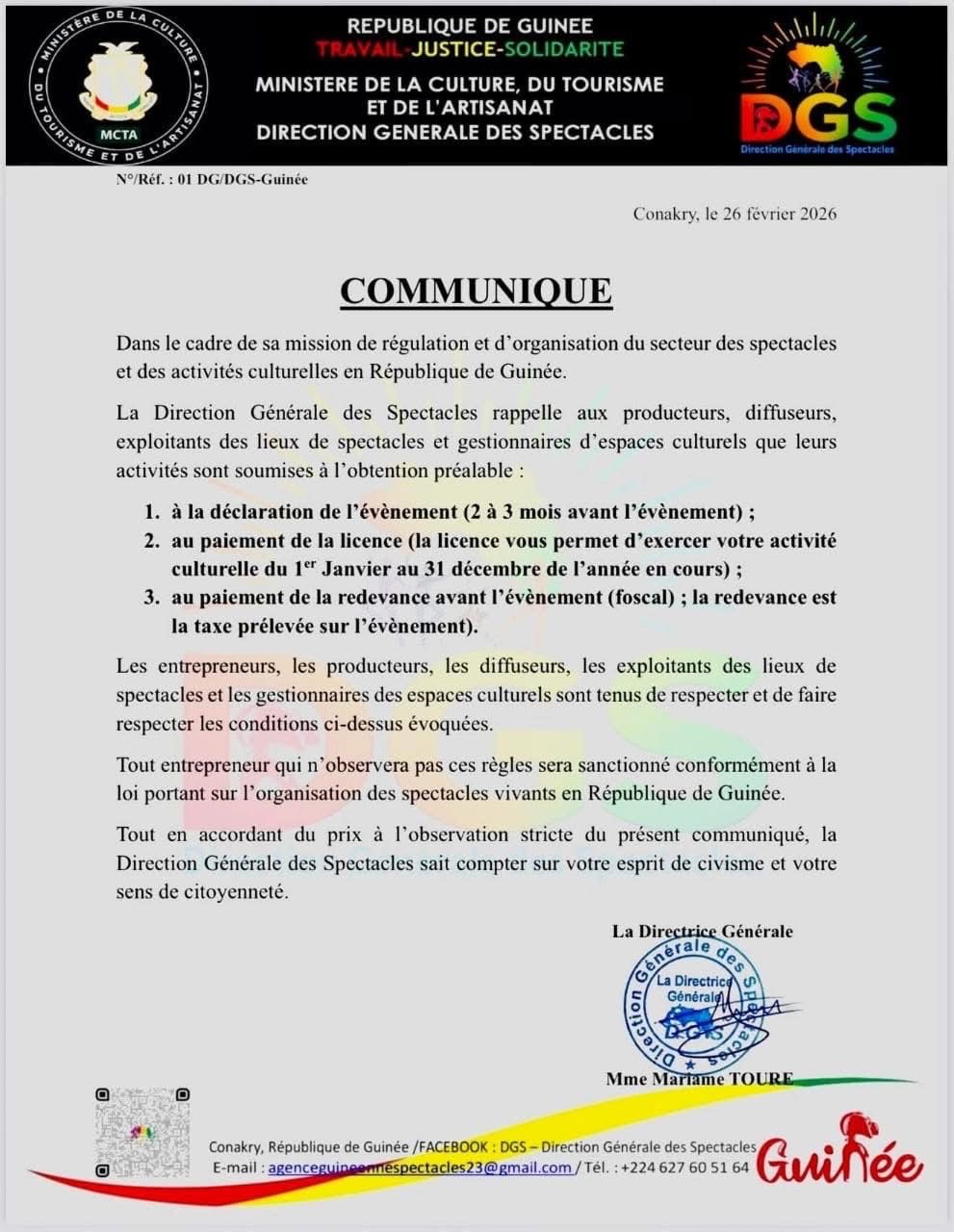 Dans le cadre de sa mission de régulation et d’organisation du secteur des spectacles et des activités culturelles en République de Guinée, la Direction Générale des Spectacles informe les producteurs, diffuseurs, exploitants de salles et gestionnaires d’espaces culturels que l’exercice de leurs activités est soumis à une autorisation préalable.