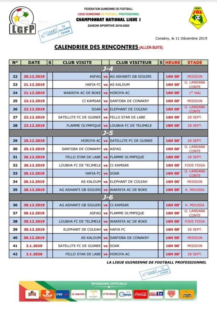 À rappeler la ligue guinéenne de football professionnel avait connu un arrêt dès les matches de 3ème journée à cause de la compétition de l’UFAO qui s’est tenue du 24 novembre au 7 Décembre dernier à conakry.