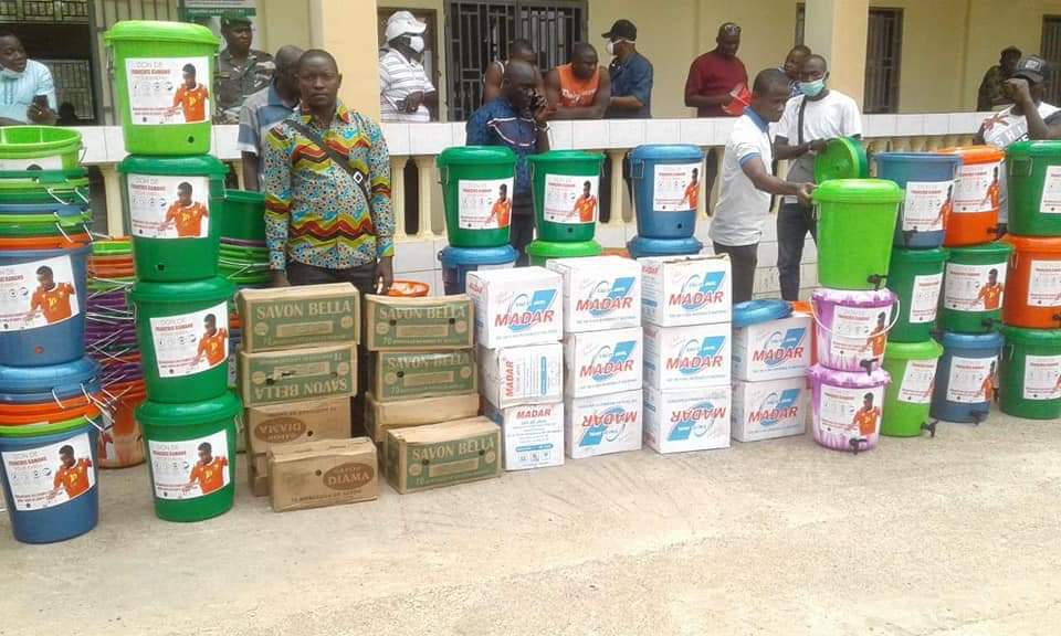 Un don composé de ( chlore, savon, sceaux)afin que la population de Kindia ait la force de lutter contre la pandemie de coronavirus dans sa ville natale et plus particulierement aux personnes démunies.